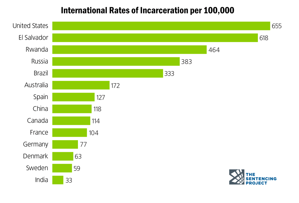 Even though the United States has less than 5% of the world’s population, it has nearly 25% of the world’s incarcerated population, largely due to the War on Drugs. The graph below is from The Sentencing Project which, “works for a fair and effective U.S. criminal justice system by promoting reforms in sentencing policy, addressing unjust racial disparities and practices, and advocating for alternatives to incarceration.” The Sentencing Project provides a wealth of statistics and sources, like the graph below, that demonstrates just how out of whack our criminal justice system is in the U.S.