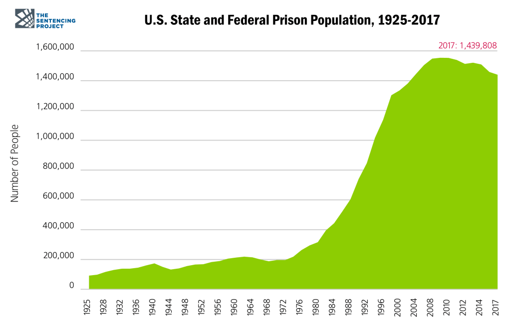 You may be asking yourself, “How did this happen?” A variety of media pundits and politicians cite different reasons that seek to explain this phenomenon. However, the truth is much more simple: we started sending more people to prison. In the “tough on crime” era in the United States there was a series of law enforcement and sentencing policy changes that resulted in a dramatic growth in incarceration. ” Since the official beginning of the War on Drugs in the 1980s, the number of people incarcerated for drug offenses in the U.S. skyrocketed from 40,900 in 1980 to 452,964 in 2017. Today, there are more people behind bars for a drug offense than the number of people who were in prison or jail for any crime in 1980.”