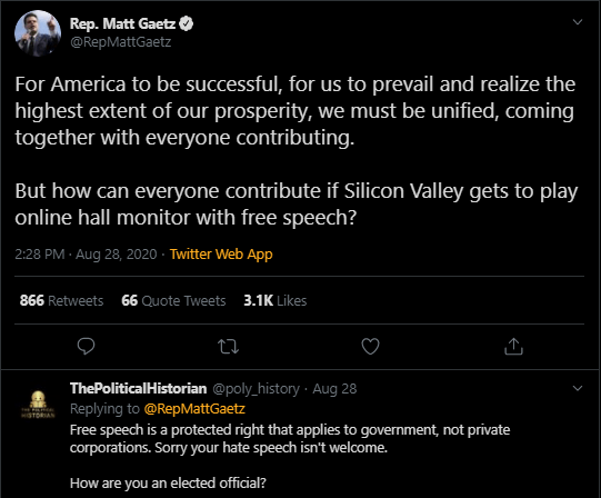 Although the caption of his Tweet explains another point of contention, it is important to emphasize it here. Either Rep. Matt Gaetz does not know that “free speech” only applies to government censorship, not private corporations, or he does know and chooses to feign otherwise, presumably to mislead his supporters to reinforce his hollow narratives.