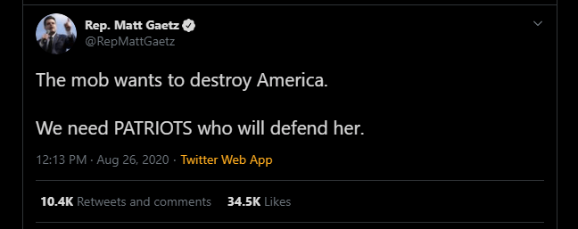 Unfortunately, right-wingers will on one hand continue to deflect accusations that they are fanning the flames of hate and division, while on the other hand continue to use their platforms to call for “law and order” and “patriots” willing to “defend” America. Rep. Matt Gaetz from Florida often echoes President Trump’s agenda with such language.
